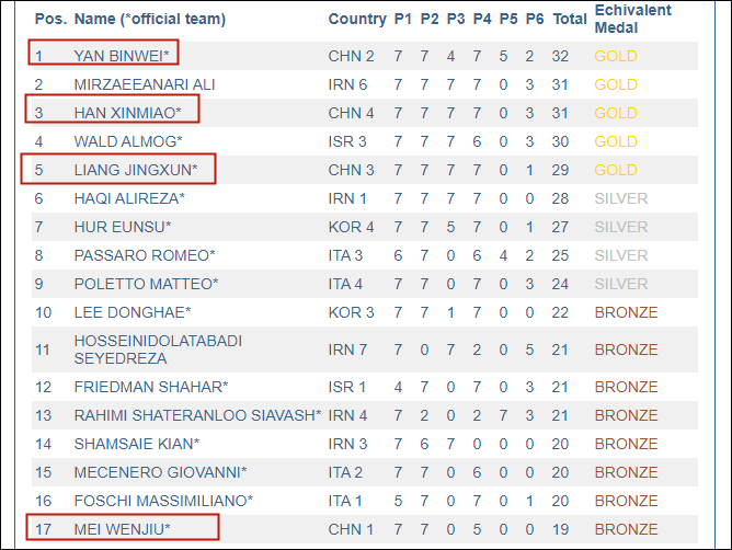 赛后,我国代表队4名队员均有斩获,获得了3枚金牌1枚铜牌的优秀成绩:严彬玮32分,金牌;韩新淼31分,金牌;梁敬勋29分,金牌;梅文九19分,铜牌。