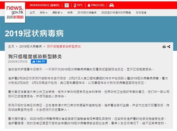 据国内媒体报道,3月4日,香港渔农自然护理署表示,一只狗只对2019冠状病毒病病毒的反覆测试呈弱阳性反应,显示已低程度感染。香港渔护署2月26日对该狗只抽取样本进行测试,2月27日从其口腔和鼻腔的样本中检测到小量2019冠状病毒病病毒。