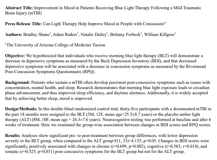 同样,亚利桑那大学的研究人员进行了一项实验,以观察蓝光如何对脑震荡和其他轻度脑外伤患者有益。初步研究涉及35名平均年龄为26岁的受试者,所有受试者在过去18个月内均发过生脑震荡。