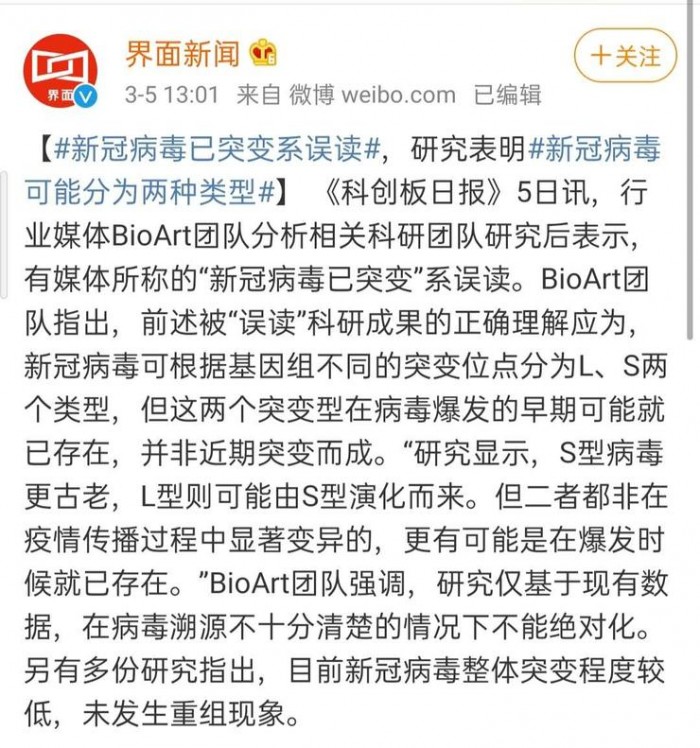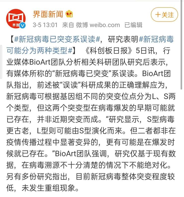 值得注意的是,今日午间,据界面新闻报道,行业媒体 BioArt 团队分析了相关科研团队的研究后表示:有媒体所称的“新冠病毒已突变”系误读,正确理解应该为:新冠病毒可根据基因组不同的突变位点分为 L 、S 两个类型,但这两个突变型在病毒爆发的早期可能就已存在,并非近期突变而成。