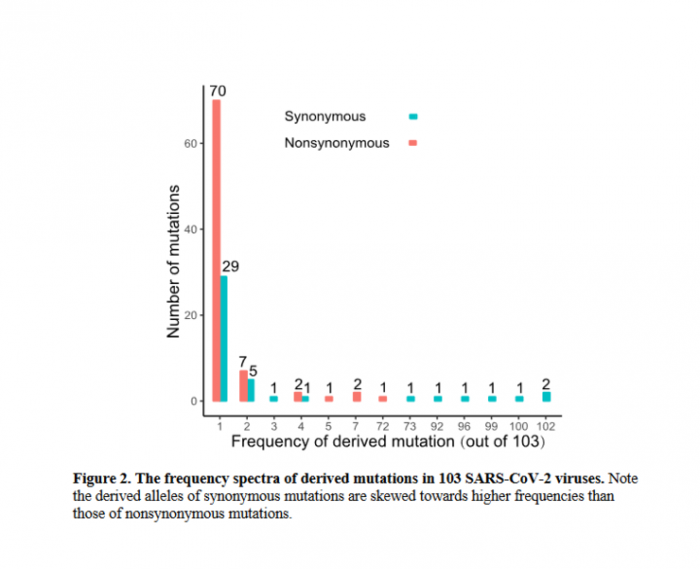 此次研究共选取了 103 个病毒基因组序列,发现病毒株已发生了 149 个突变点,其中包括 43 个同义突变( synonymous mutation )和 83 个错义突变( nonsynonymous mutation ),而 70% 的病毒序列具有7 个相同的正义突变,外加 1 个相同的错义突变( L84S ),从而影响了病毒 6 个蛋白质的功能。
