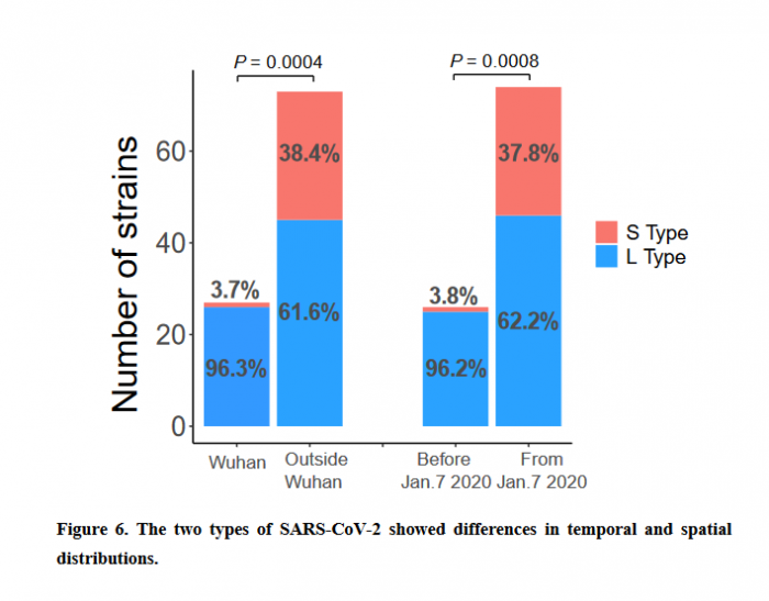 作者进而比较了 1 月 7 日前后 S 型和 L 型所占比例的变化,他们发现 L 型在病毒株中的比例下降,而 S 型比例上升。对于这一有些反常的变化,作者也给出了自己的假设——因为中国采取了强有力的防疫措施,L 型病毒的患者可能更容易表现出症状,因而更容易受到人工干预,从而使 L 型新冠病毒受到的负选择压力更大,感染的人数由此变少。