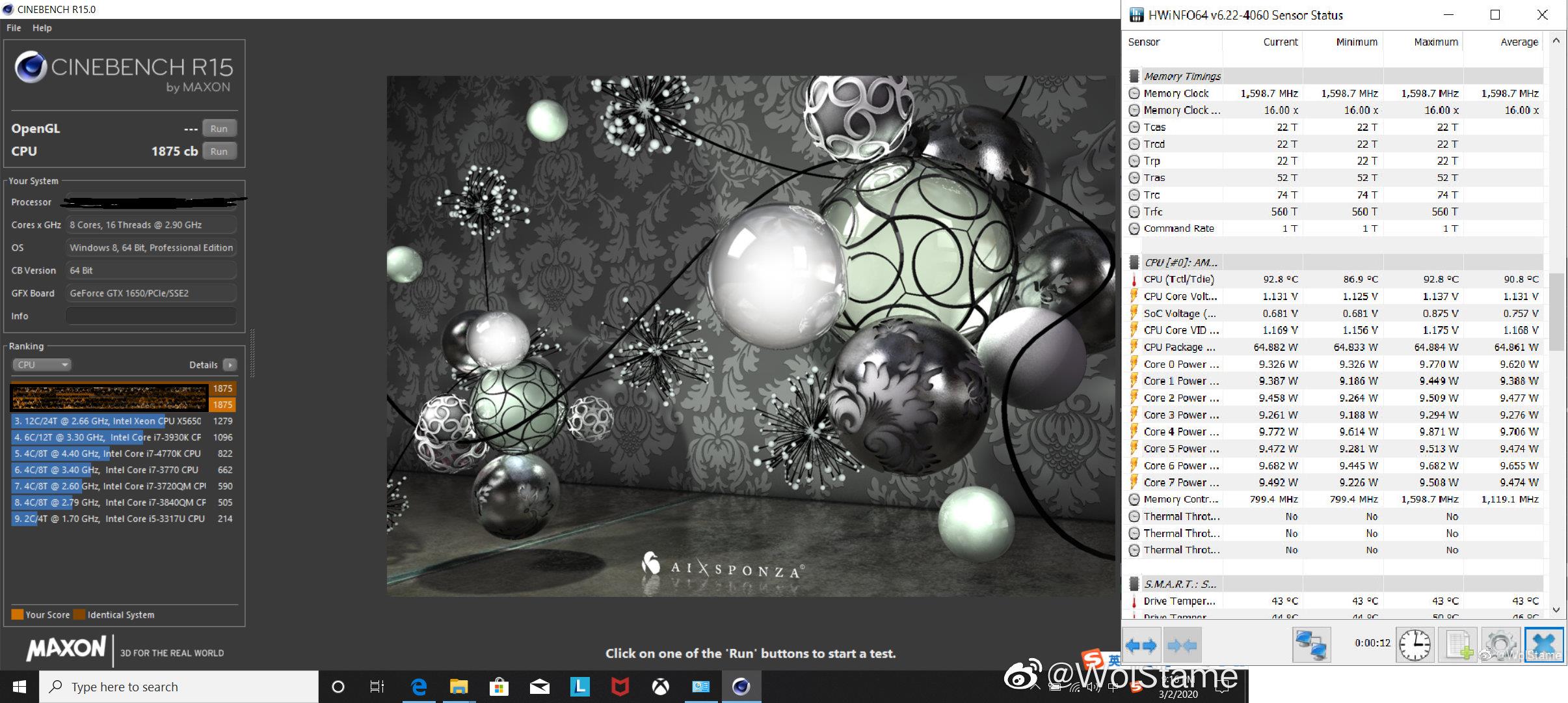 旁边的HWiNFO64显示了系统的运行状态,内存频率则是3200MHz,这个频率不算太高,但是也不至于拖核显后腿太多。CPU核心的最大运行功耗时65W,最高温度93度。