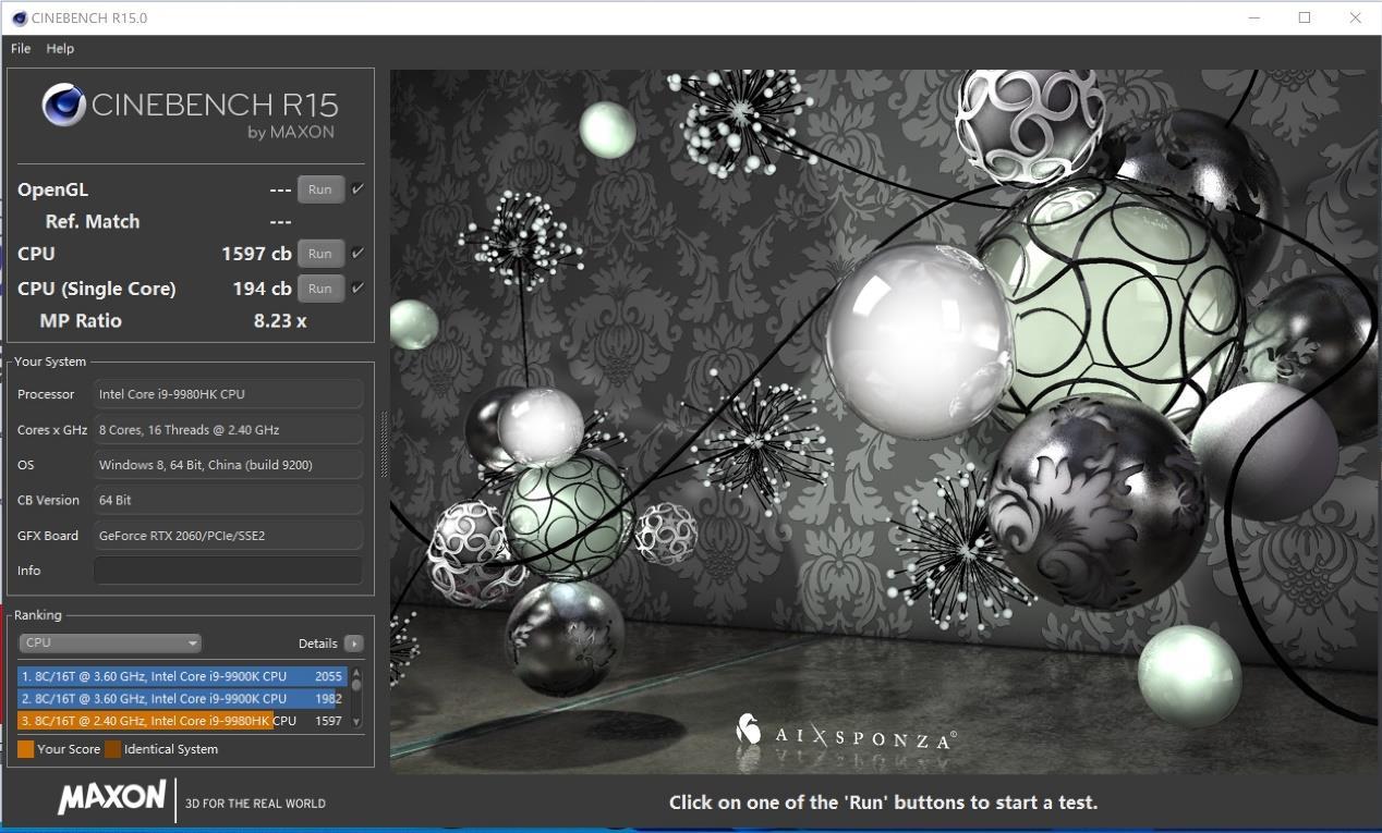 这是我们此前在华硕灵耀X2 Pro中测试的成绩,i9-9980HK跑Cinebench R15的多线程分数也就只有1597,与锐龙7 4800H之间差距将近有300分,接近20%的差距。