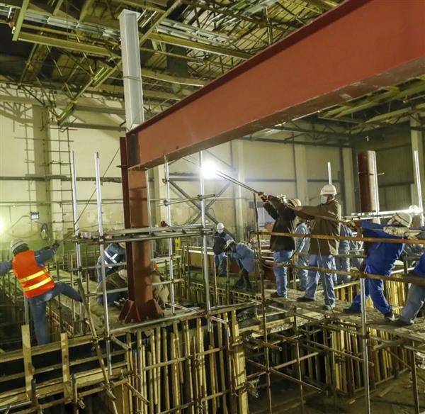 燕山石化施工人员与恒天集团下属的宏大研究院相关人员以战时状态,24小时奋战一线,以对标火神山、雷神山医院的建设速度分秒必争;