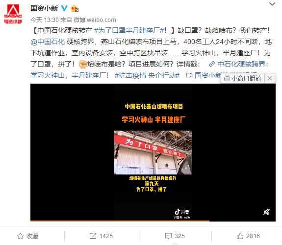 10天建成一座1000人的医院,火神山让全球见证了中国医疗上的速度。现在轮到制造业比拼速度了,由于口罩原料熔喷布紧缺,中国石化硬核转产,子公司燕山石化半个月建了一座工厂。