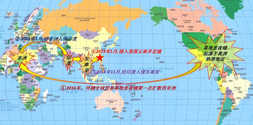 2018年5月,人们第一次在南亚大陆的印度发现草地贪夜蛾的踪迹。预感到跨洲际传播的巨大威胁,联合国在第一时间发布了“全球重大虫害预警”,可惜为时已晚。2018年11月,草地贪夜蛾被发现已侵入孟加拉国和斯里兰卡,2018年12月侵入缅甸(东南亚),标志南亚这一植物乐园彻底沦陷。