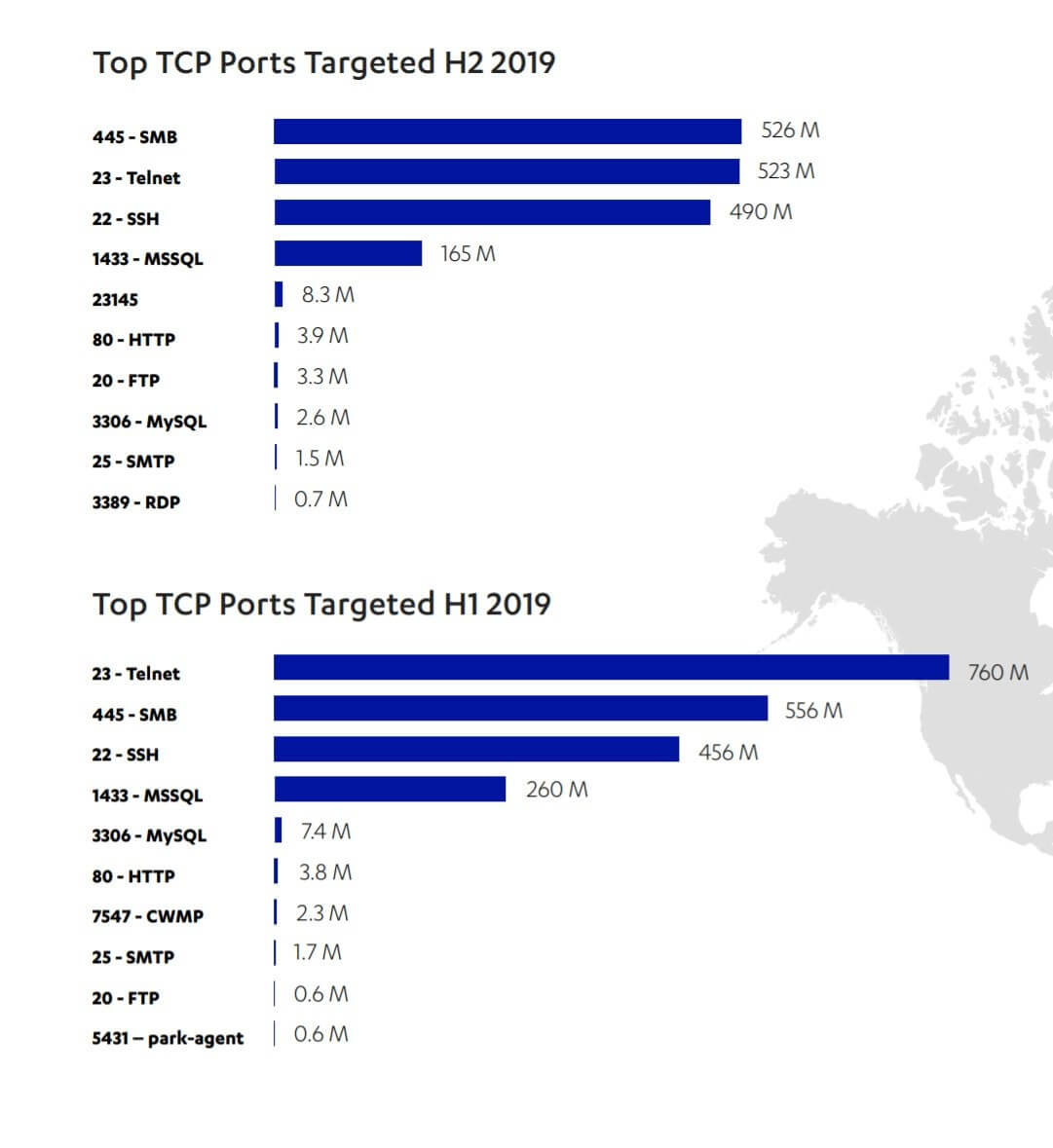 当提到最受攻击的TCP端口时,SMB端口445则是当中最受欢迎的,其有5.26亿次点击量,这表明攻击者依旧热衷于使用SMB蠕虫和诸如欺骗机器人之类的攻击。Telnet以5.23亿次的点击量位居第二,这表明对IoT设备的攻击仍非常常见。