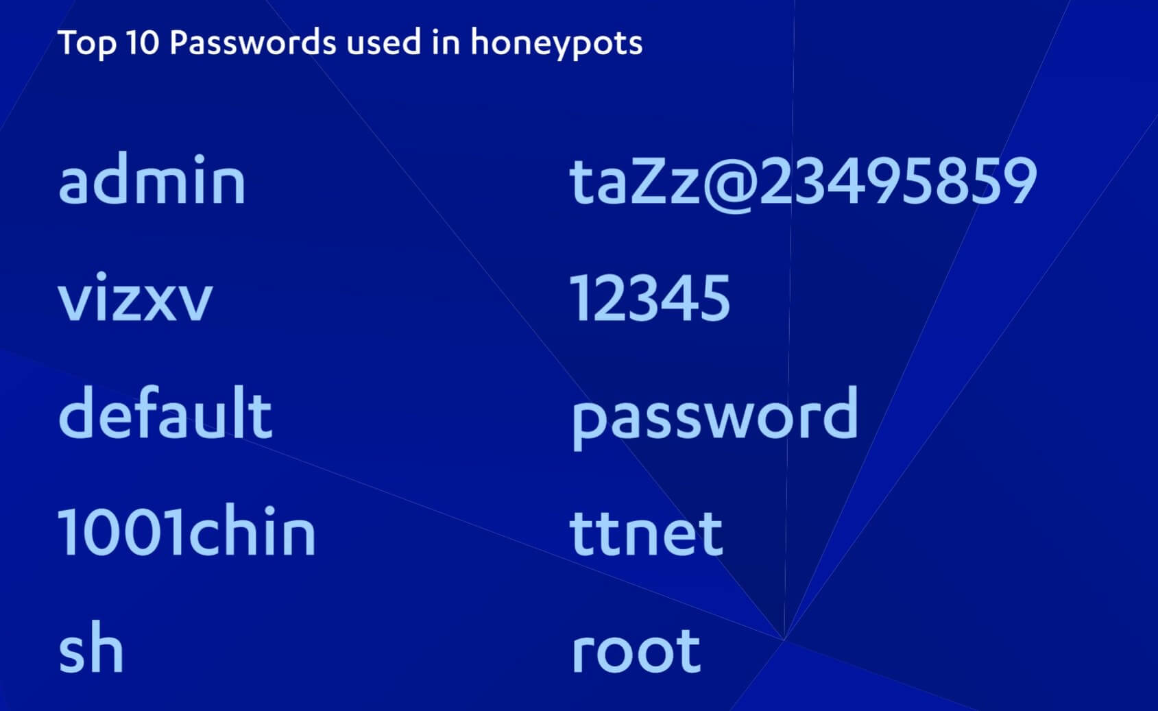 许多黑客尝试使用的另一个密码则是“vivx”,这是中国大华公司DVR的默认密码。名单上的另外两个密码“1001chin”和“taZz@23495859”也是其他嵌入式设备的出厂默认密码,包括路由器。
