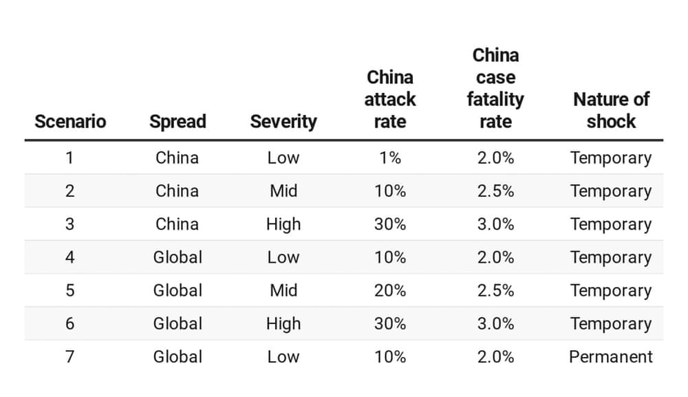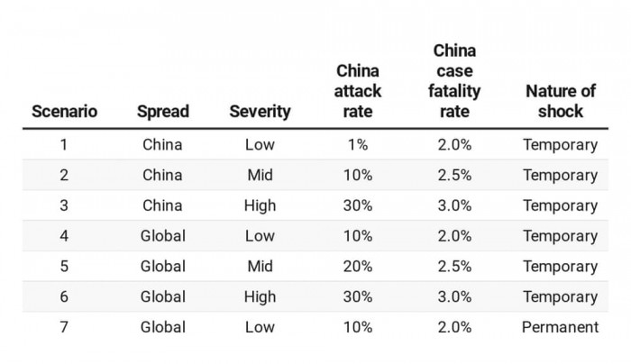 澳大利亚国立大学研究人员估计,即使是疫情发展最不严重的场景——也就是最好的情况,全球GDP将损失2.4万亿美元,造成1500万人死亡。他们的模型参考了1968-1969年的香港流感疫情,估计有约100万人在这次疫情中丧生。