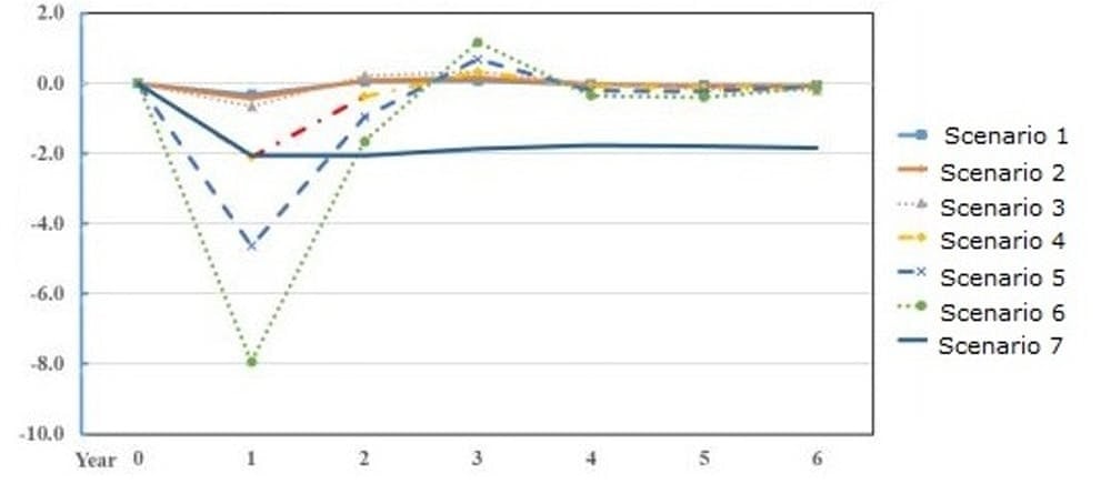 7种场景中的4种,衡量了新冠肺炎疫情在中国境外传播的影响,第7种场景衡量了未来每年不定期小规模出现对全球的影响。