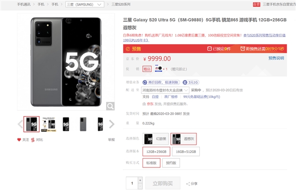 Galaxy S20 Ultra 12GB+256GB版售价9999元,16GB+512GB版售价11999元,提供幻游黑、遐想灰两种配色。