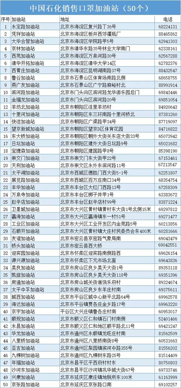 以下是这次销售口罩的50座中国石化加油站: