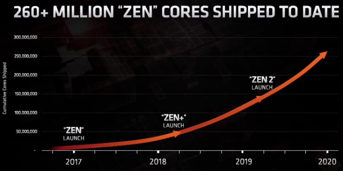 距离2017年3月2日正式推出锐龙处理器已经过去整整三年了,现在的AMD已经在高性能CPU市场上站稳了脚跟,今天财务分析师会议上AMD发布了5nm Zen4及7nm RDNA2路线图,足够A饭兴奋一天了。AMD CTO Mark PaperMaster还宣布了一个更好的消息,那就是Zen处理器上市三年来出货了达到了2.6亿核心——AMD太狡猾了,这里说的是CPU核心,而非CPU销量。