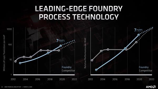 在这次的分析师大会上,AMD还对比了自家CPU的工艺与竞争对手的工艺,指出AMD在2022年之前都会保持工艺优势。