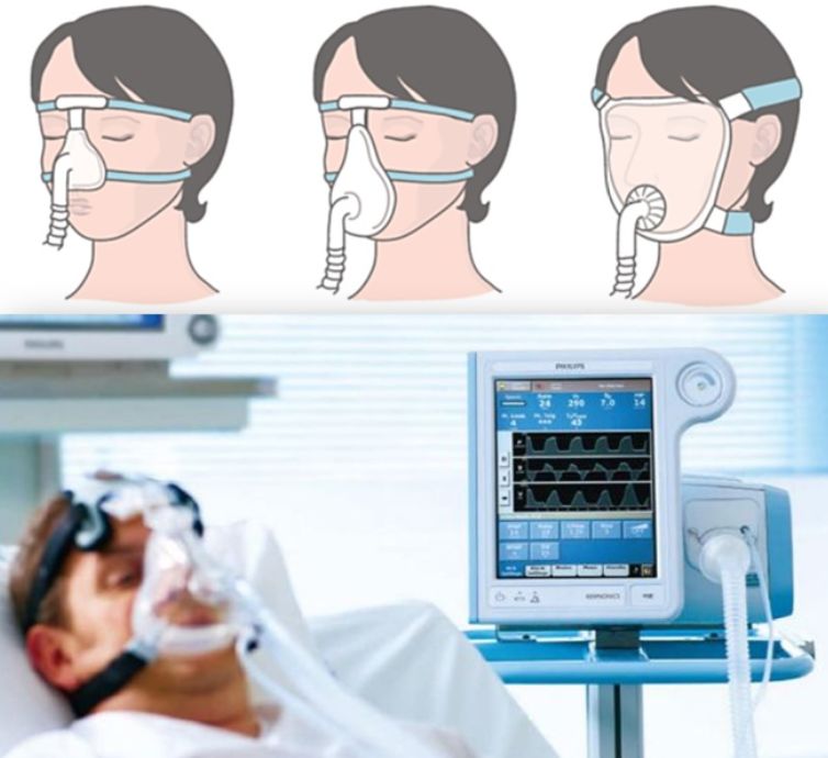轻一点的可以使用无创呼吸机。这种呼吸机也是通过面罩和患者相连,通过施加一定的压力(气压)打开气道,帮助肺部膨胀,减少患者呼吸疲劳。