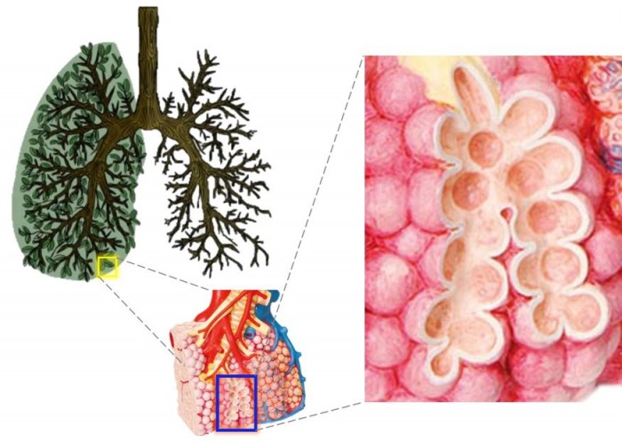 肺泡和毛细血管之间透过肺泡壁和血管壁交换气体(实际上,肺泡壁和血管壁大部分都融合在了一起,总厚度才0.4 微米,如此亲密无间就是为了让气体交换更高效) | lookfordiagnosis.com