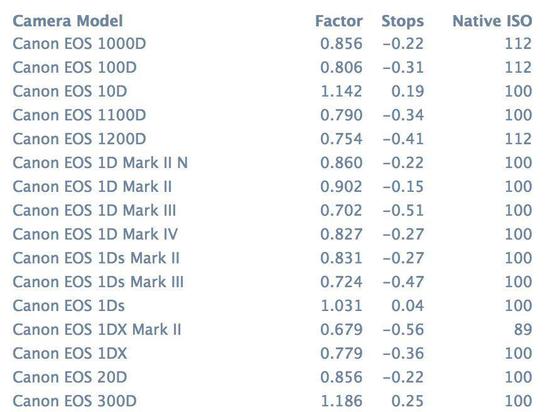 每部相机都拥有自己的原生ISO,上图是部分佳能相机的原生ISO。