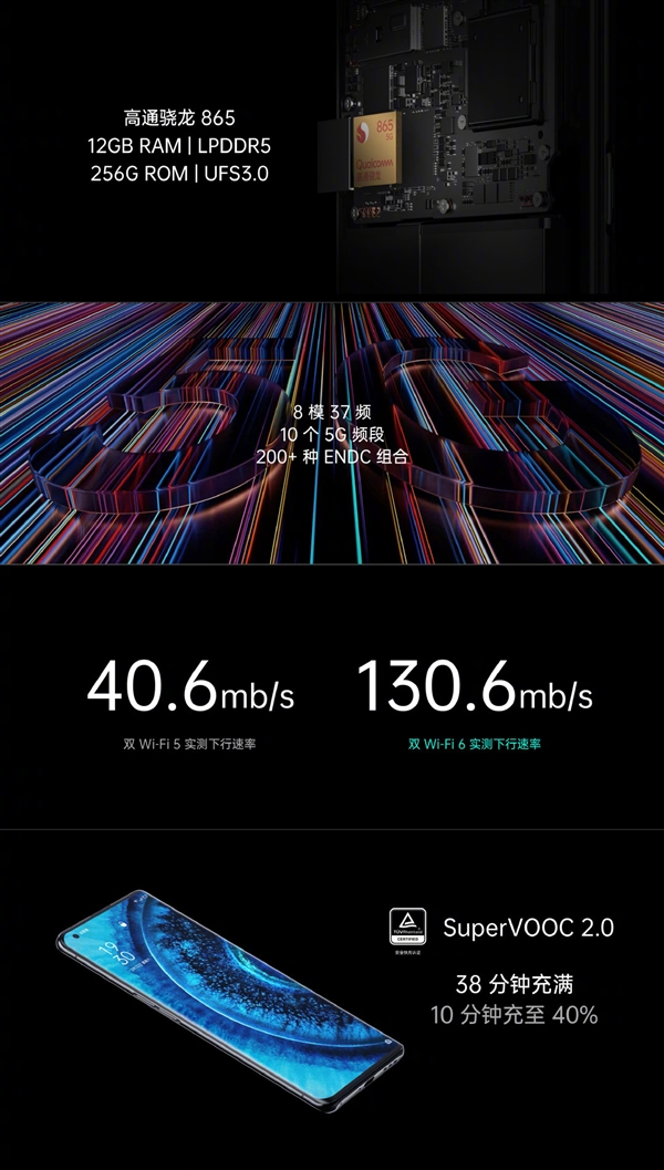 今天,全新的OPPO Find X2登场亮相,还是基于高通骁龙865,搭配LPDDR5内存、UFS 3.0+闪存,官方宣布安兔兔跑分可达637099,全球第一,比红魔5的原纪录又提高了3375。