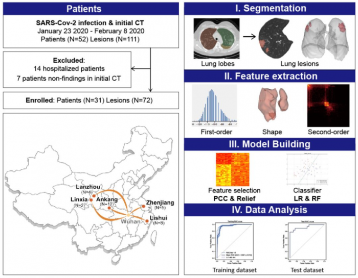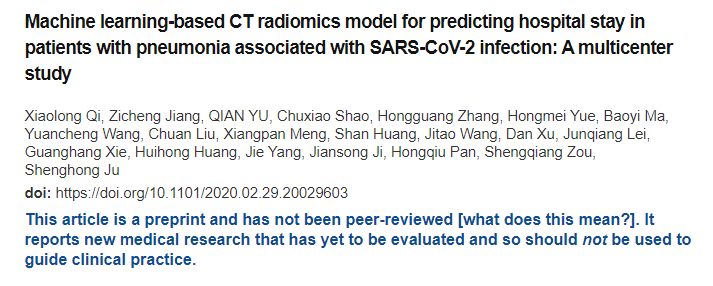 2020 年 3 月 3 日,来自安康、丽水、镇江、兰州、临夏 5 家指定医院的团队在预印版平台 medRxiv 发表未经同行评审的,首次报道了基于机器学习建立的 CT 影像组学模型对新冠肺炎患者住院时间的预测价值。