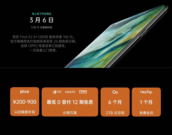 价格方面,Find X2 8GB+128GB 5499元、8GB+512GB 5999元,现已接受预约,3月13日上午10点正式开售夜海(玻璃)、碧波(陶瓷)版本,另有茶橘(素皮)版本待定。
