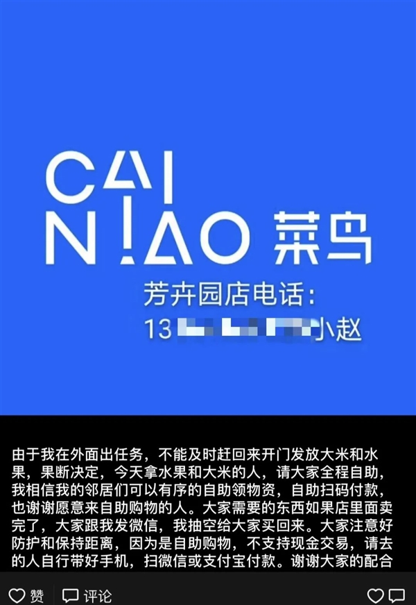 有一天下午,他刚好外出任务,但为了保障小区居民生活,就发了个朋友圈,把门打开让大家自己来拿。