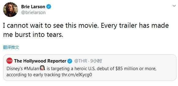 日前,“惊奇队长”布丽·拉尔森在社交网络转发了一条关于“《花木兰》北美首周票房预计为8500万美元”的新闻,并激动表示:“我等不及要看这部电影了,每个预告都让我热泪盈眶。”