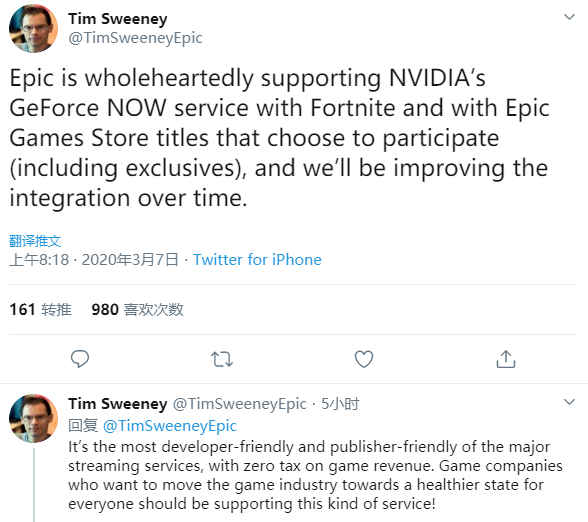 Epic老总 Tim Sweeney 今日(3月7日)发布推文,表示 Epic 将全力支持 Nvidia 云游戏服务 GeForce Now,他表示每一家希望游戏行业能够良性发展的游戏公司都应该这么做。
