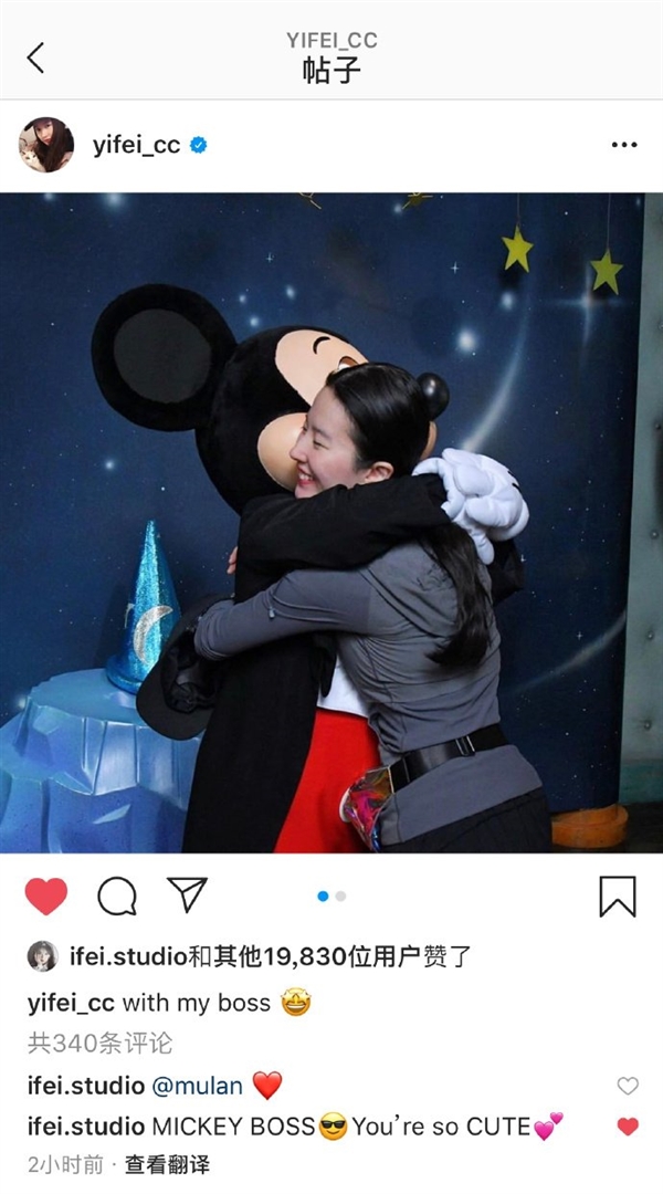 刘亦菲在ins上po出和米奇的合影,配文“with my boss(和我的老板)”“我的老板超可爱”。照片中刘亦菲穿运动服素颜出镜,面色红润,和米奇又是合影又是拥抱,笑得超灿烂。