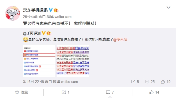 近日,罗永浩将进军直播界,成为网友热议话题。京东手机通讯也在微博喊话:“罗老师考虑来京东直播不! 我帮你联系!”3月4日,锤子科技CEO罗永浩在与网友互动时透露,过些天就会开始定期直播活动。之前罗永浩在微博发起过一次投票:“你们买东西时会看电商直播吗?或者你们会看电商直播买东西吗?”
