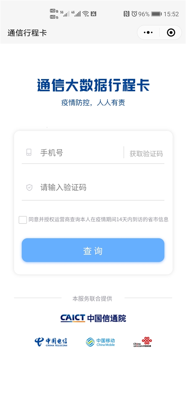“通信大数据行程卡”基于电信大数据,由三大运营商统一提供接口,仅须填写手机号、验证码并确认本人授权,无须填写身份证号、家庭住址,不收集其他个人信息,操作上更为简便和安全,充分保护用户隐私。