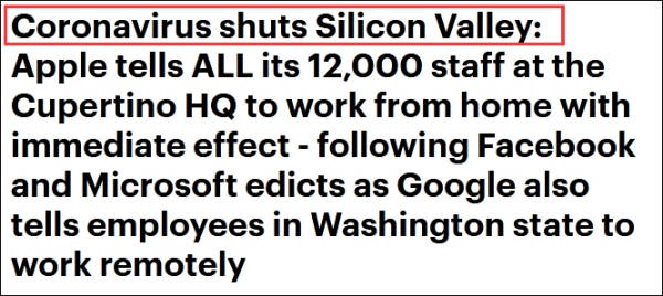 疫情对美国的冲击越来越严重,苹果、脸书、微软、亚马逊、谷歌、推特等许多美国科技巨头也开始抗疫,纷纷要求自己的员工在家办公,远离硅谷和西雅图总部。“(新冠)病毒让硅谷关门了,” 《每日邮报》在6日的报道中这样写道。