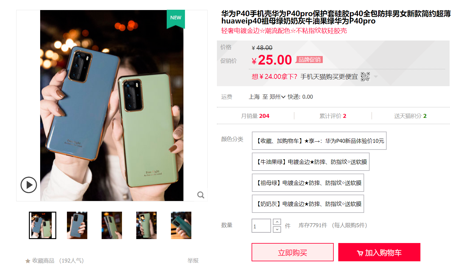 3月7日消息,一家天猫店铺开售P40系列保护套,售价25元。如图所示,P40、P40 Pro为矩阵相机,区别在于摄像头数量。根据此前曝光的信息,P40系列至少包含P40、P40 Pro两款,其中P40 Pro确定为徕卡五摄方案,包含一枚5200万主摄及一枚潜望式长焦镜头,支持OIS光学防抖,支持十倍光学变焦。