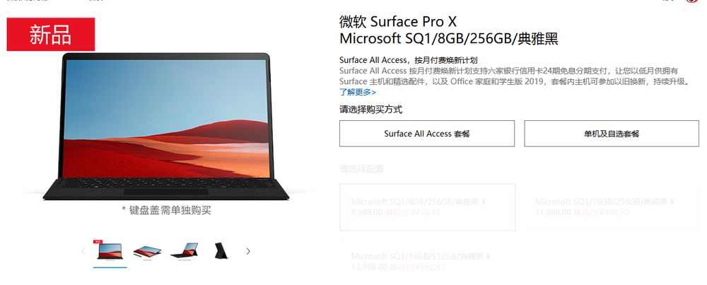 价格方面,Surface Pro X 8GB+256GB售价9988元,16GB+256GB售价 11988元,16GB+512GB售价13988元。此外,商业客户还可选购Surface Pro X商用版,起售价为8388 元。