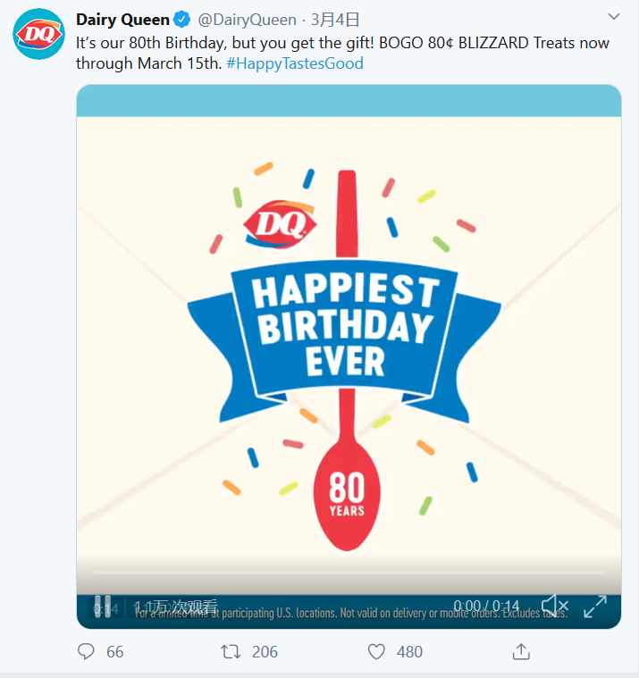 冰淇淋和快餐连锁店Dairy Queen(简称DQ)本月迎来了80周岁生日,为此推出了买一赠一的优惠活动。例如全价购买第一个经典暴风雪系列,能够以80美分的价格获得第二个。本次活动将会持续到3月15日。