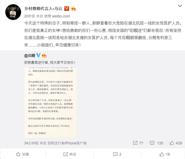 给医生送奶茶,送炸鸡、送小龙虾之后,今天马云转发微博,表示要给在湖北一线的女医护群体花呗额度翻倍和3年分期免息。 按照官方公开数据进行估算,支援武汉和武汉的本地的女医护超过了20万人。