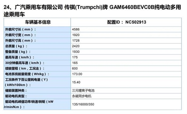 动力方面,新车采用了一台来自日本电产最大功率为135kW(184Ps)的永磁同步电机,最大扭矩为350N·m。NEDC续航达600km版本车型的电池系统能量密度达到173Wh/kg,NEDC工况下的能耗为15.4KWh/100km,整备质量为1930kg。