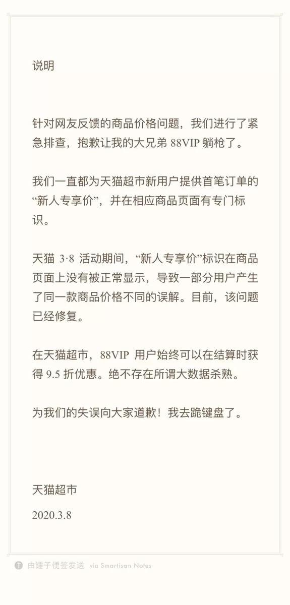 近日有网友反映,88VIP会员价格比普通用户高,存在大数据杀熟。3月8日早间,阿里巴巴旗下天猫超市在微博回应,其为新用户提供首笔订单时会有“新人专享价”,并在相应商品页面有专门标识,而天猫3·8活动期间,这个标识没有被正常显示,因而产生误解。