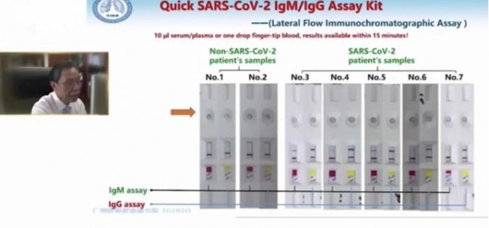 在首届新冠肺炎多学科线上论坛上,钟南山院士发布了其团队最新研究成果——针对新型冠状病毒感染对快速免疫球蛋白M(IgM)检测试纸、恒温扩增芯片。据钟南山院士介绍,快速检测试纸是经过对 72000 个病例研究而开发出,通过测流式免疫层析法实现检测。患者感染 7 天后或是出现症状 3 到 4 天后,即可检出 IgM。