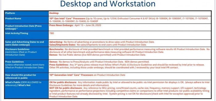 Intel Comet Lake-S十代酷睿桌面版已经流传了太久,但迟迟就是不肯发布,从目前的形势看预计要到4月份了。今天,外媒曝出了第一份有关Intel十代桌面酷睿的NDA保密协议情况,其中标注产品发布时间为4月13日至6月26日。