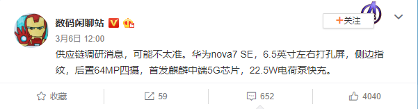 根据国内知名博主@数码闲聊站上周从供应链获得的爆料,华为Nova 7 SE将会采用6.5英寸打孔屏幕,侧边指纹,后置6400万像素主摄,22.5W电荷泵快充,而重点在于该机将会搭载麒麟中端的5G芯片,应该是尚未发布的麒麟820处理器。
