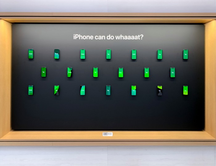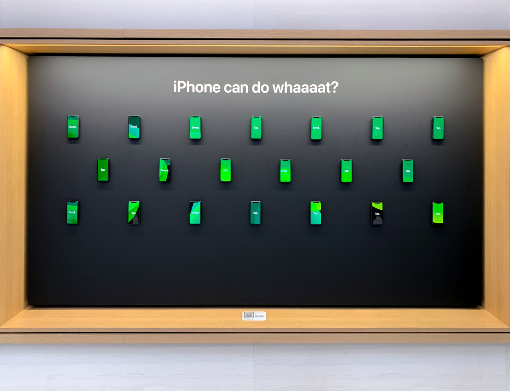 Apple Store 又有了全新的交互体验,这次苹果在一面墙上安装了 20 台 iPhone,邀你学习 iPhone 各种独特的技巧和功能。每一台 iPhone 展示的功能都不同,有的是软件优势,有的是硬件优势。这面墙的标题是 iPhone can do whaaaat?用 4 个 a 来突出 iPhone 的功能强大。