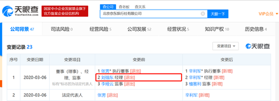 3月9日上午消息,天眼查数据显示,3月6日,京东旗下全资子公司北京京东旅行社有限公司发生工商变更,刘强东卸任公司经理,张雱卸任公司执行董事、法定代表人,以上职位均由辛利军接任;另外,李娅云卸任该公司监事,由檀赛利接任。
