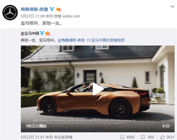 去年5月时年66岁、执掌戴姆勒集团长达13年之久的迪特·蔡澈(Dieter Zetsche)正式退休,卸任戴姆勒董事会主席、梅赛德斯-奔驰全球总裁职位,@宝马中国特意制作了一则短片致敬蔡澈,并表示“奔驰一生,宝马相伴。”随后@梅赛德斯-奔驰转发,称“宝马相伴,奔驰一生。”
