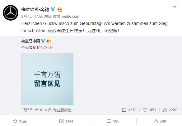 奔驰宝马这对“相爱相杀”的对手,再一次把奥迪给抛弃了。3月7日@宝马中国官方发布微博称“今天是我104岁生日……”,在评论区的网友评论已超过800条。随后,@梅赛德斯-奔驰官方微博转发表示,“Herzlichen Glückwunsch zum Geburtstag! Wir werden zusammen zum Sieg fortschreiten. 衷心祝你生日快乐!为胜利,同驰骋!”