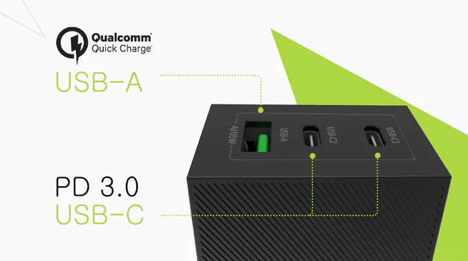 SHARGE 65W氮化镓充电器拥有两个USB-C PD输出口,一个USB-A QC输出快充接口。快充协议方面支持QC4 +、PD3.0、QC3.0、SCP、FCP、AFC和PE+。