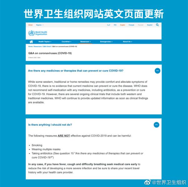 9日,在世卫组织官网的相关页面上,“常见问题”有关的传统草本药物的内容,其多种语言版本已被更新。世卫组织表示,该专题页面还将持续更新。