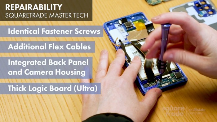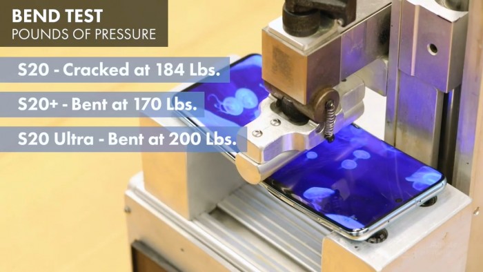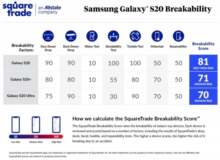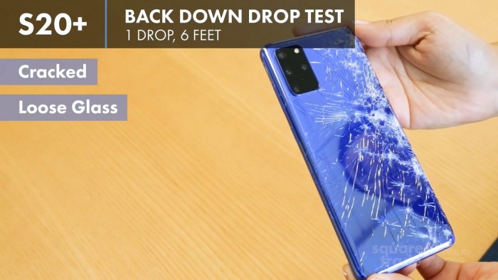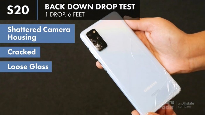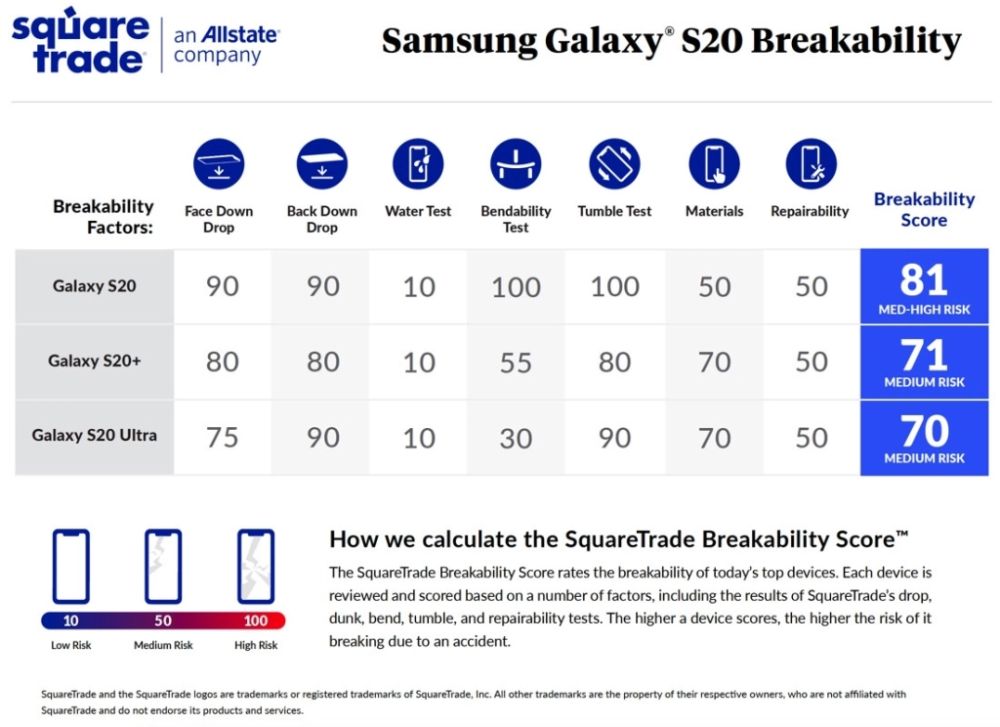 Square Trade的耐用性测试中,包括从不同高度掉落到混凝土、翻滚掉落、掰弯测试以及浸水测试。根据测试结果来看,所有三款Galaxy S20型号均没有通过掉落和翻滚测试。
