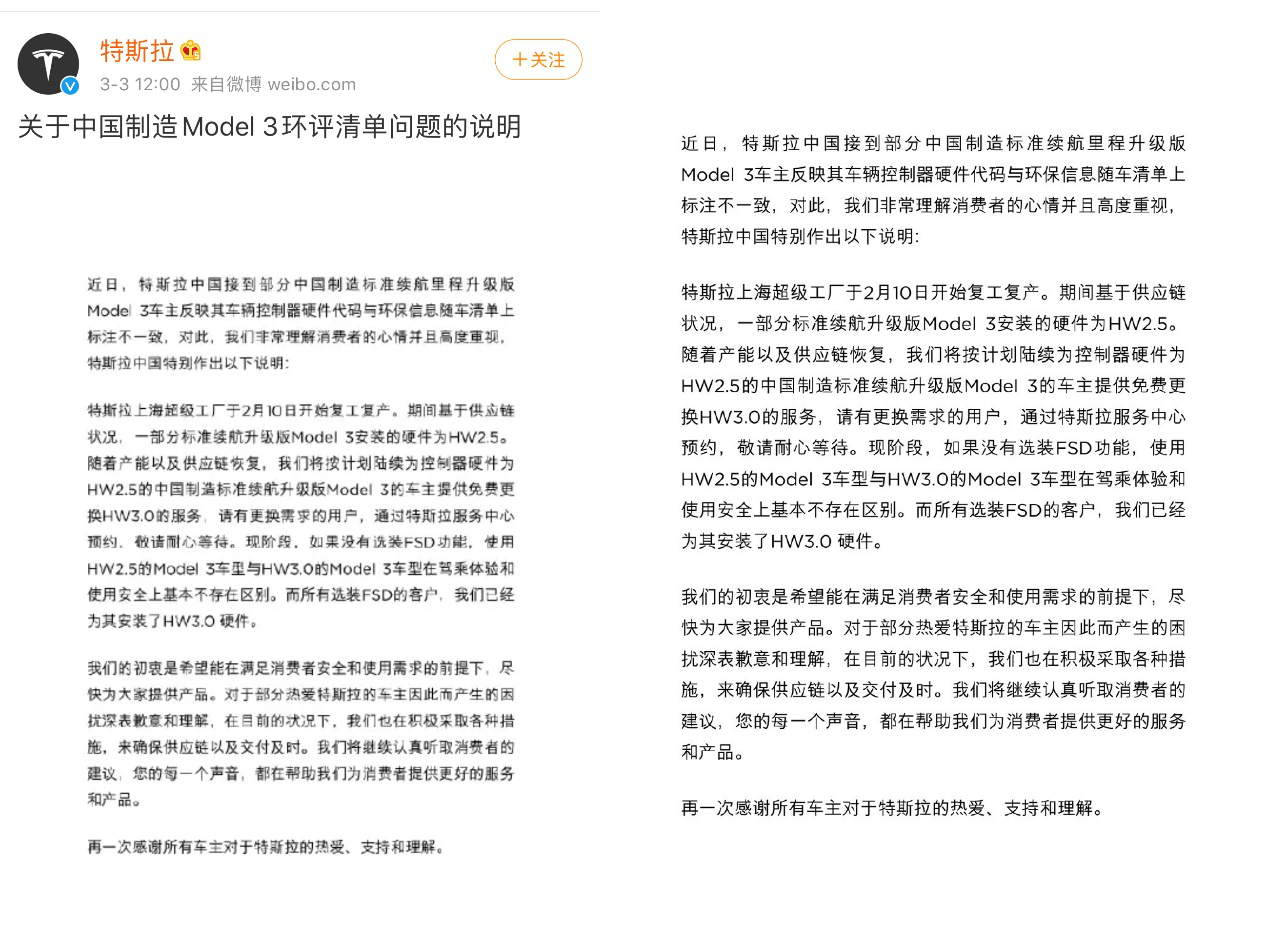随后特斯拉在3月3日发布官方声明,表示由于供应链尚未完善,在目前交付的国产Model 3中,确实存在HW2.5和HW3.0混装的情况出现,随着产能以及供应链的恢复,特斯拉将计划陆续为控制器硬件为HW2.5的国产Model 3免费更换HW3.0硬件。