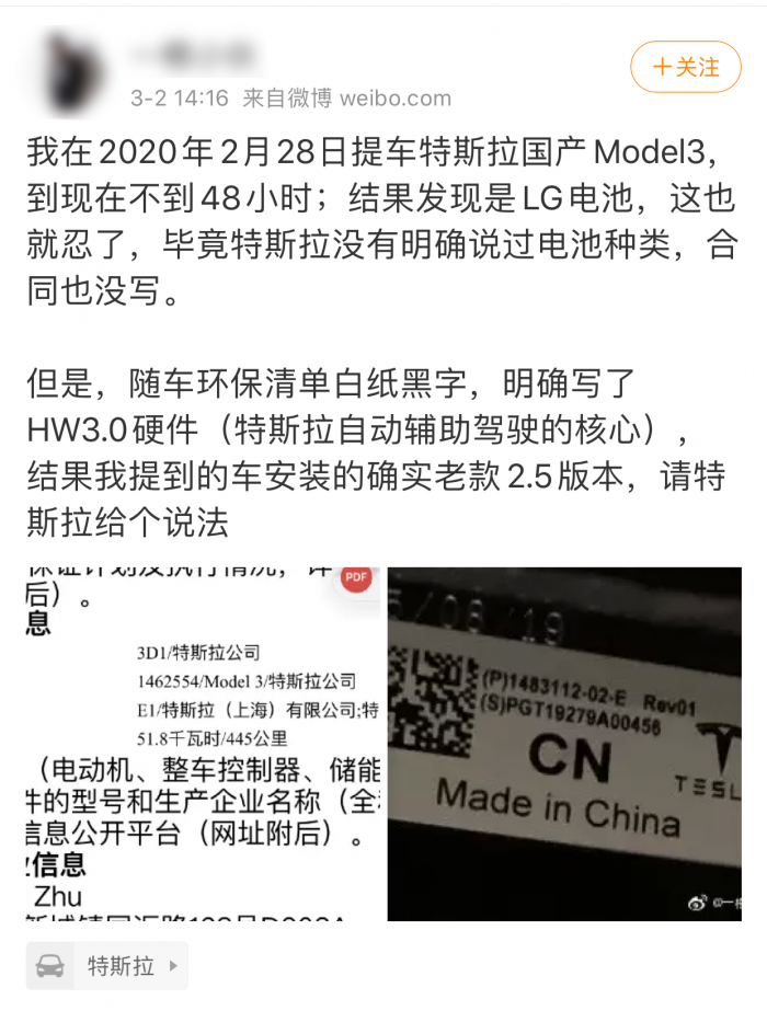 特斯拉又出事了。近日,有特斯拉车主在微博上发文表示,自己的国产特斯拉Model 3上车辆控制器硬件为HW2.5(Hardware 2.5),与环保信息随车清单标注的HW3.0不符,疑似硬件降级欺瞒消费者。